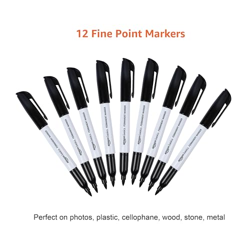 Amazon Basics Fine Tip Permanent Markers for Writing, Drawing, Quick Drying, Office, School, and Home Use, Black, 12 Pack
