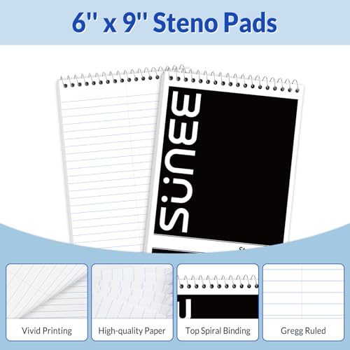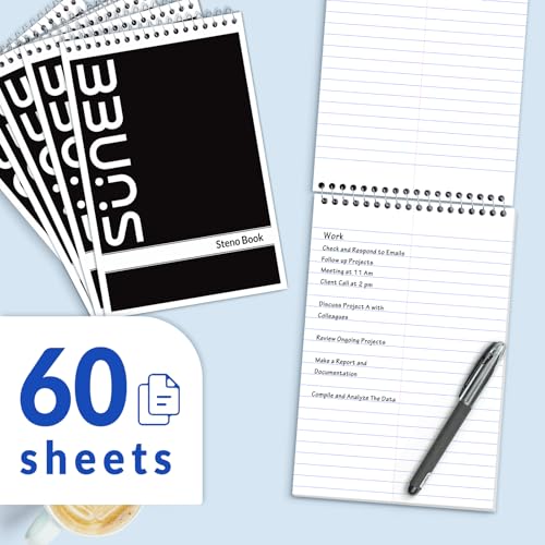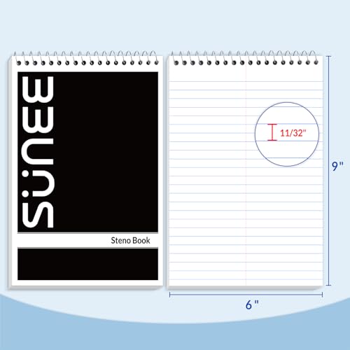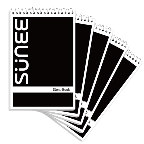 SUNEE 5 Pack Steno Pads 6×9, Gregg Rule, 60 Sheets, Spiral Notebook 6×9, White Paper, Take Notes with Top Spiral Notebook, for School, University, College, Work, Office, Black