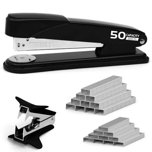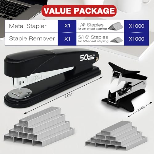 Metal Stapler Heavy Duty 50 Sheet Capacity with 2000 Staples and Staple Remover, No Jam, Non-Slip Stapler for Desk, Black Office Supplies for Teacher, Office Clerks