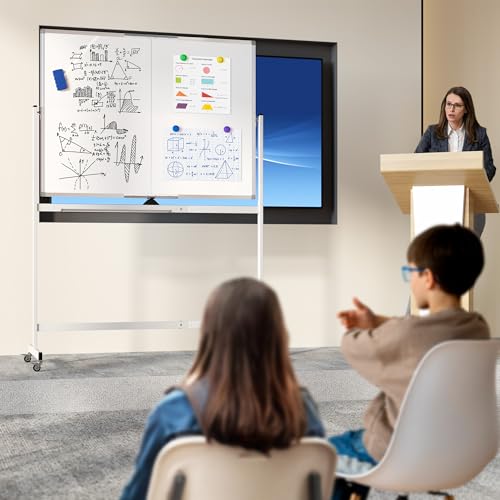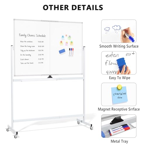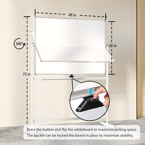 Double-sided Whiteboard: The dry erase board is double sided and reversible design, press the button and flip the whiteboard to maximize writing space, the buckle can be locked the board in place to maximize stability.
